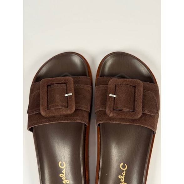 Sandal i mocka med gummisula och spänne.